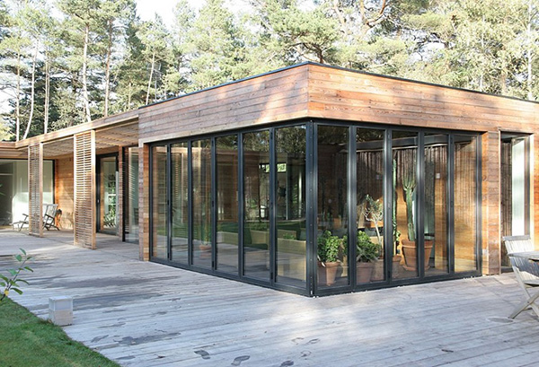 Design is based on the Danish atrium house form of the ‘60s and ‘70s, this glass and wood home by Swedish architect